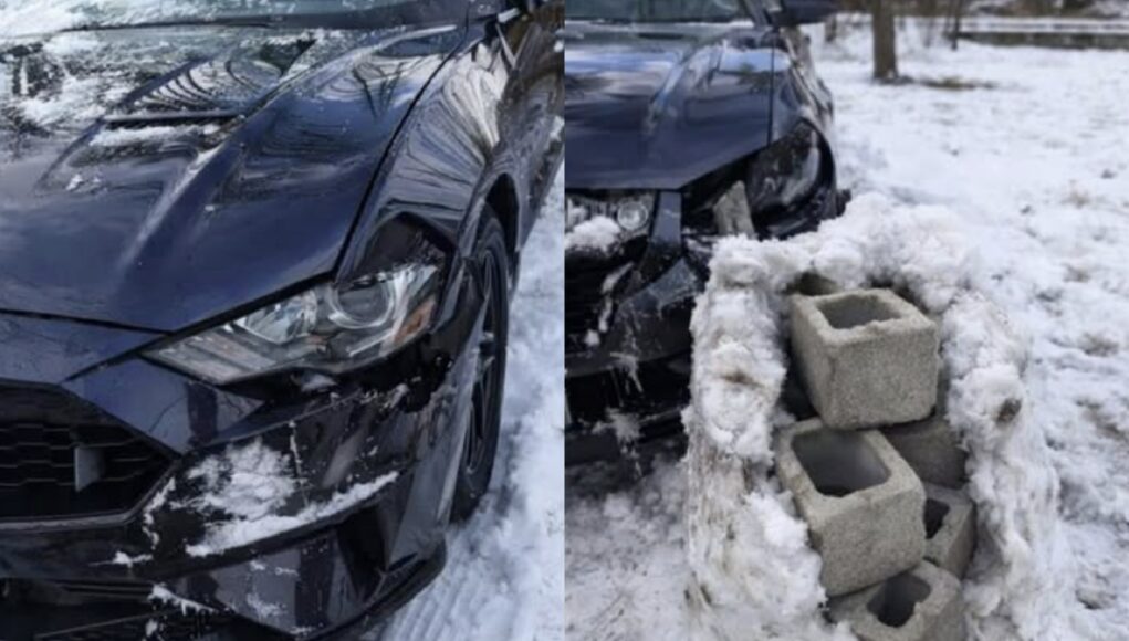 Automobilist rijdt moedwillig sneeuwpop kapot, sneeuwpop zit vol met zware bakstenen