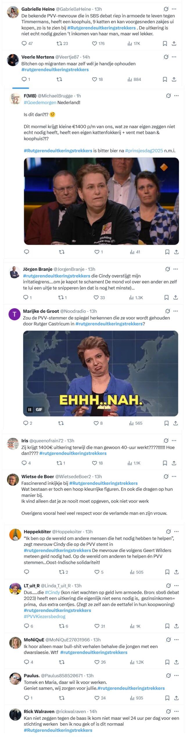 De eerste aflevering van de nieuwe NPO-serie Rutger en de Uitkeringstrekkers veroorzaakte flink wat opschudding. Presentator Rutger Castricum volgt drie deelnemers: Cindy uit Zaandam, Ed uit Den Haag en Tomek, die verlamd raakte na een duikongeluk. Hoewel bij de meeste verhalen begrip leeft, kwam Cindy vooral in het middelpunt van de kritiek te staan. Ze blijkt een Wajong-uitkering te ontvangen, heeft een koopwoning, een partner met werk en verdient daarnaast aan kattenfokkerij.
