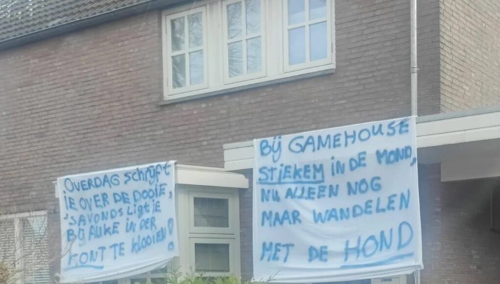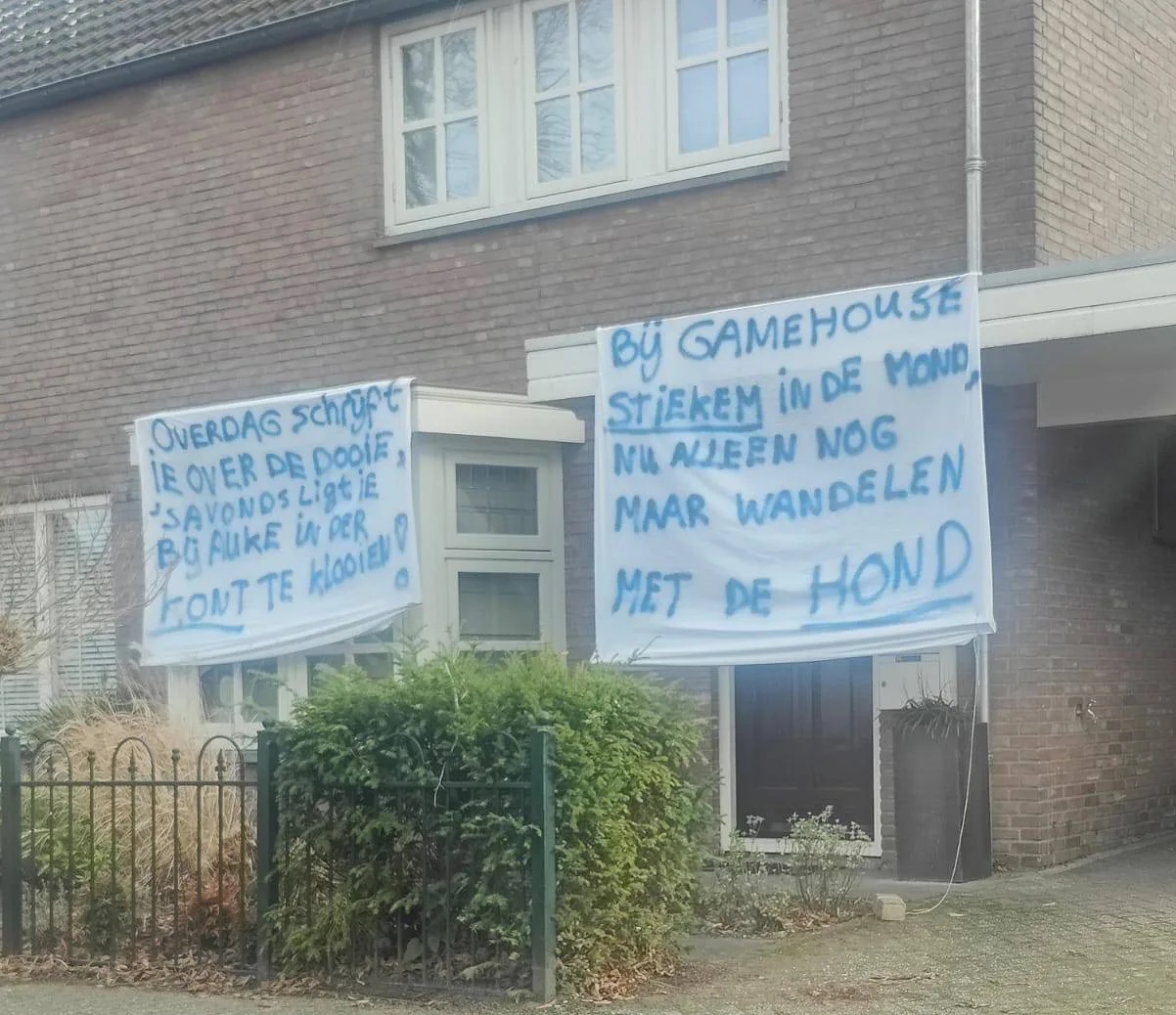 Aan het huis hingen namelijk twee spandoeken met nogal pittige teksten, waardoor de zaak snel veel aandacht kreeg. Op het eerste spandoek stond: “Overdags schrijft ie over de dooie, ’s avonds ligt ie bij Auke in der kont te klooien!” Het tweede spandoek was al even opmerkelijk: “Bij Gamehouse stiekem in de mond, nu alleen nog maar wandelen met de hond.” De spandoeken zorgden voor flinke opschudding in het dorp, waar men inmiddels meer gewend is aan ludieke humor dan aan openlijke dorpsroddel op doekformaat.