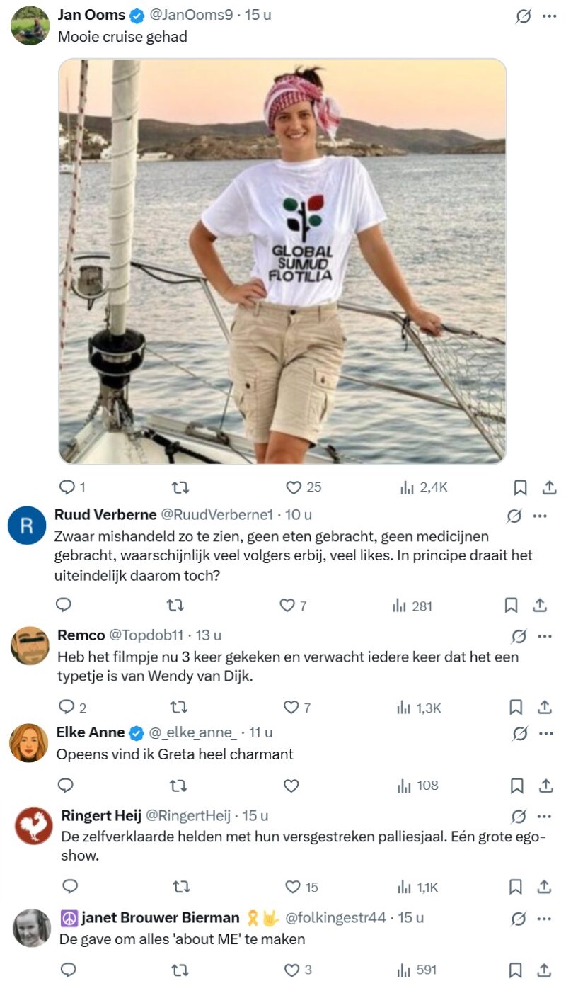 De Nederlandse activiste Roos Ykema, die meereisde met de Global Sumud Flotilla naar Gaza, kreeg flink wat aandacht toen ze na haar terugkeer een emotionele toespraak hield. In haar betoog sprak ze over opluchting nu “niet langer in de loop van een geweer” te hoeven kijken, maar in plaats daarvan “klappende handjes en aanbiddende gezichtjes” te zien. Ze plaatste haar rede op Instagram en kreeg daar veel positieve reacties, maar elders leidde de video tot kritiek en ongemak.
