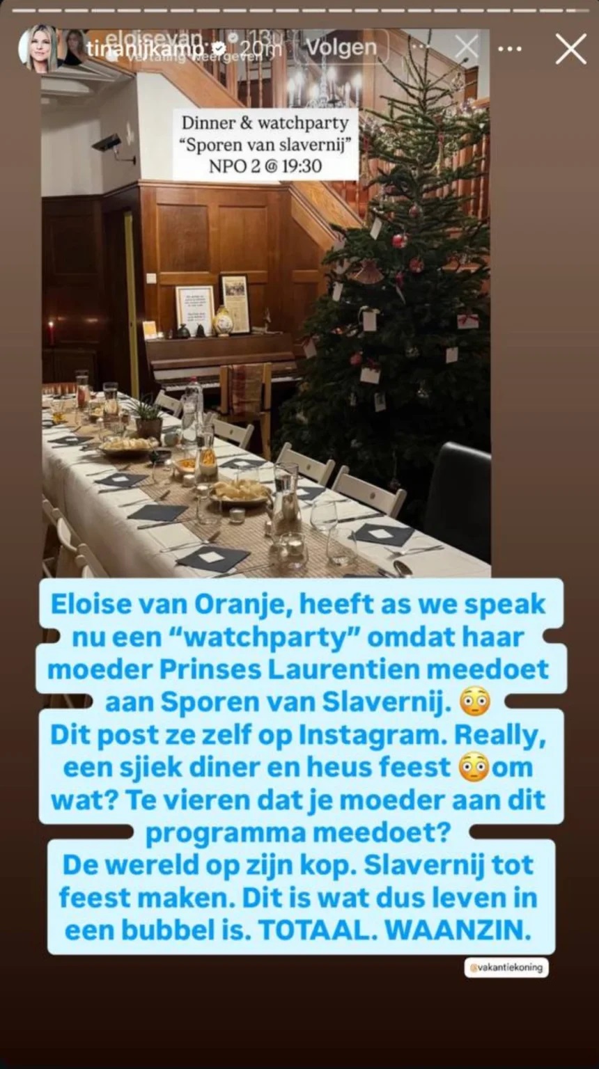 Alsof de controverse nog niet groot genoeg was, gooide gravin Eloise olie op het vuur met een Instagram-post. Ze deelde een foto van een chic gedekte tafel met de tekst: ‘Dinner & watchparty, Sporen van slavernij, NPO 2, 19.30 uur.’ Tv-kenner Tina Nijkamp reageerde furieus en schreef: “Eloise van Oranje, heeft as we speak, nu een ‘watchparty’ omdat haar moeder prinses Laurentien meedoet aan Sporen van Slavernij.” Ze spaarde haar woorden niet: “Really, een sjiek diner en heus feest om wat? De wereld op zijn kop. Slavernij tot feest maken… TOTAAL. WAANZIN.” De post werd later verwijderd.