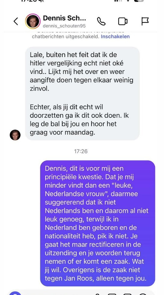 De spanningen tussen Lale Gül en Dennis Schouten zijn ontstaan na uitspraken in het programma RoddelPraat, waarin Gül zich aangevallen voelt op haar afkomst. Naar aanleiding daarvan heeft zij aangifte gedaan, waarna beide partijen nu ook rechtstreeks met elkaar in contact zijn getreden. Schouten liet in een bericht weten: “Lale, buiten het feit dat ik de hitler vergelijking echt niet oké vind.. Lijkt mij het over en weer aangifte doen tegen elkaar weinig zinvol. Echter, als je dit echt wil doorzetten ga ik dit ook doen. Ik leg de bal bij jou en hoor het graag voor maandag.”