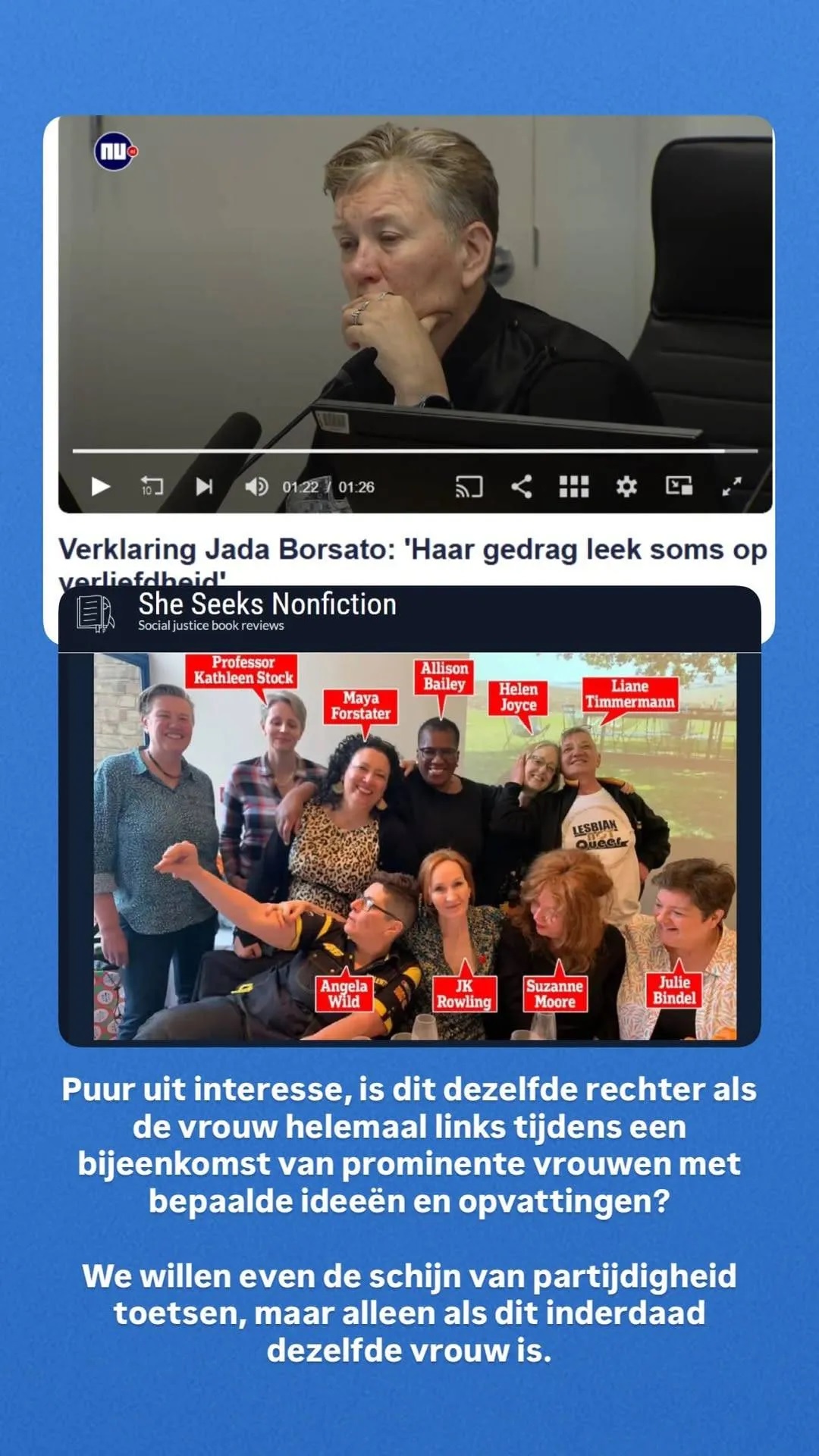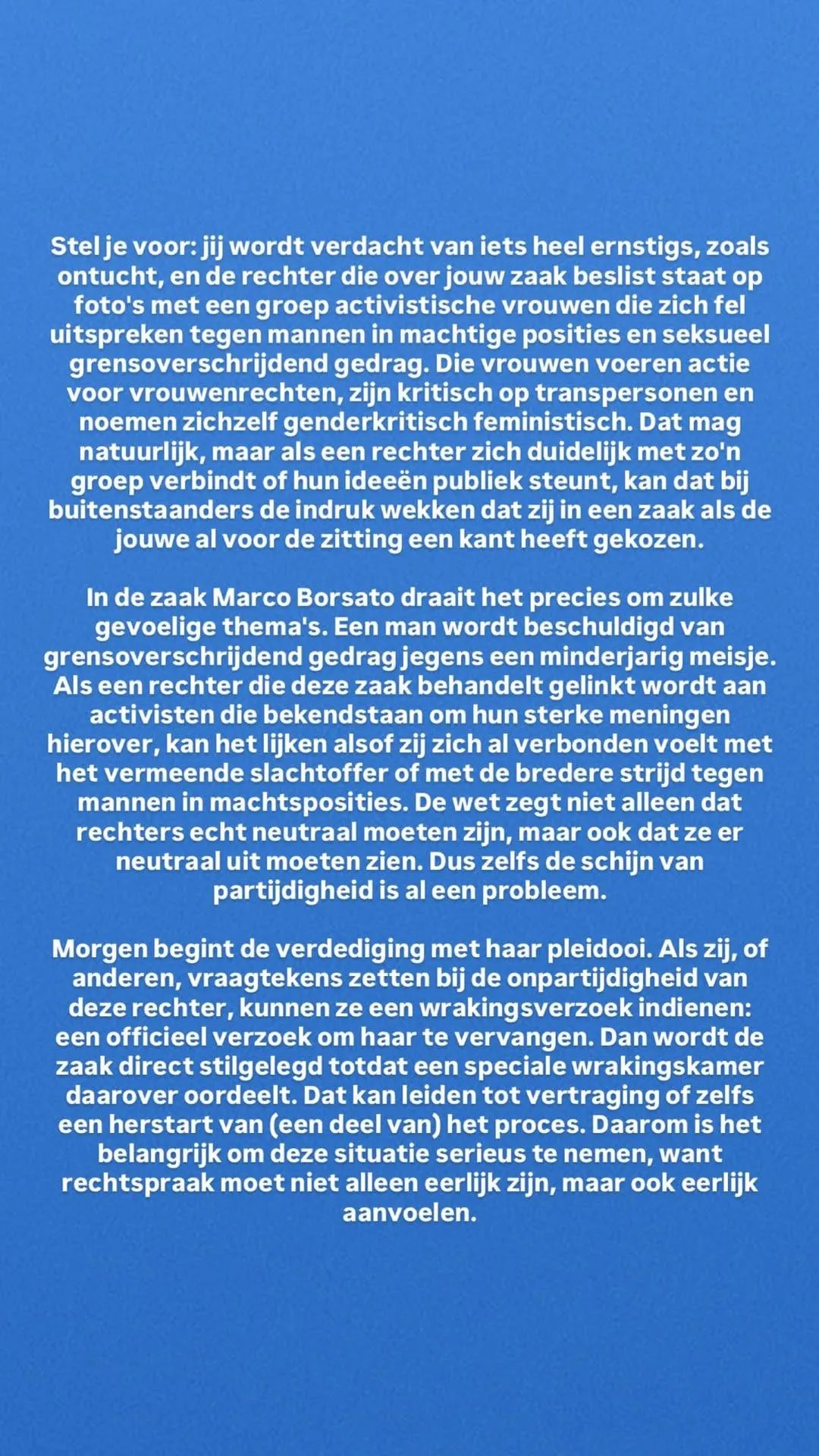 Er is ophef ontstaan rond een rechter in de zaak tegen Marco Borsato. De rechter is in de video hierboven helemaal links te zien. Heleen den Haan is een van de drie rechters. Zij zou in 2022 hebben geluncht met Harry Potter-auteur J.K. Rowling. Dat lijkt onschuldig, maar zorgt nu voor discussie over mogelijke belangenverstrengeling. Volgens juicekanaal RealityFBI zat Den Haan aan tafel met feministische activisten en politici. Onder hen was ook Rowling, die vaker is beschuldigd van anti-trans uitspraken.