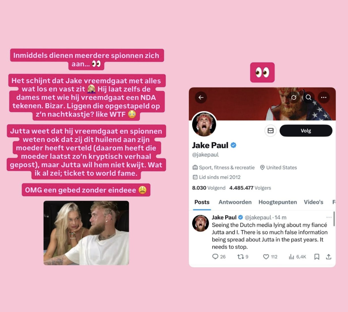 De geruchten rond Jutta Leerdam en Jake Paul blijven zich opstapelen, mede door nieuwe uitspraken van Yvonne Coldeweijer. Zij stelt: “Inmiddels dienen meerdere spionnen zich aan…” en komt met een opvallende beschuldiging: “Het schijnt dat Jake vreemdgaat met alles wat los en vast zit. Hij laat zelfs de dames met wie hii vreemdgaat een NDA tekenen. Bizar.” Daarmee krijgt de toch al turbulente situatie opnieuw een extra lading.