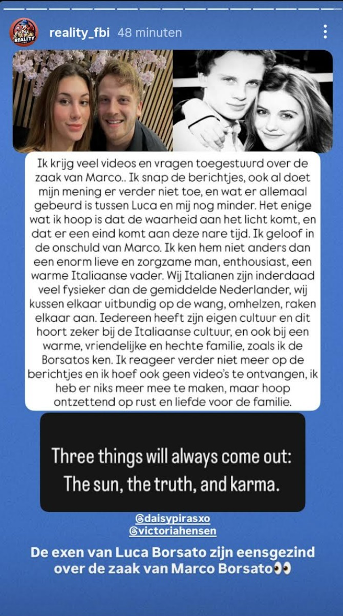 Nu is ook een andere ex van Luca aan het woord. Daisy stelt: “Ik krijg veel video’s en vragen toegestuurd over de zaak van Marco.. Ik snap de berichtjes, ook al doet mijn mening er verder niet toe. en wat er allemaal gebeurd is tussen Luca en mij nog minder. Het enige wat ik hoop is dat de waarheid aan het licht komt, en dat er een eind komt aan deze nare tijd. Ik geloof in de onschuld van Marco. Ik ken hem niet anders dan een enorm lieve en zorgzame man, enthousiast, een warme Italiaanse vader. Wij Italianen zijn inderdaad veel fysieker dan de gemiddelde Nederlander, wij kussen elkaar uitbundig op de wang, omhelzen, raken elkaar aan. Iedereen heeft zijn eigen cultuur en dit hoort zeker bij de Italiaanse cultuur.”