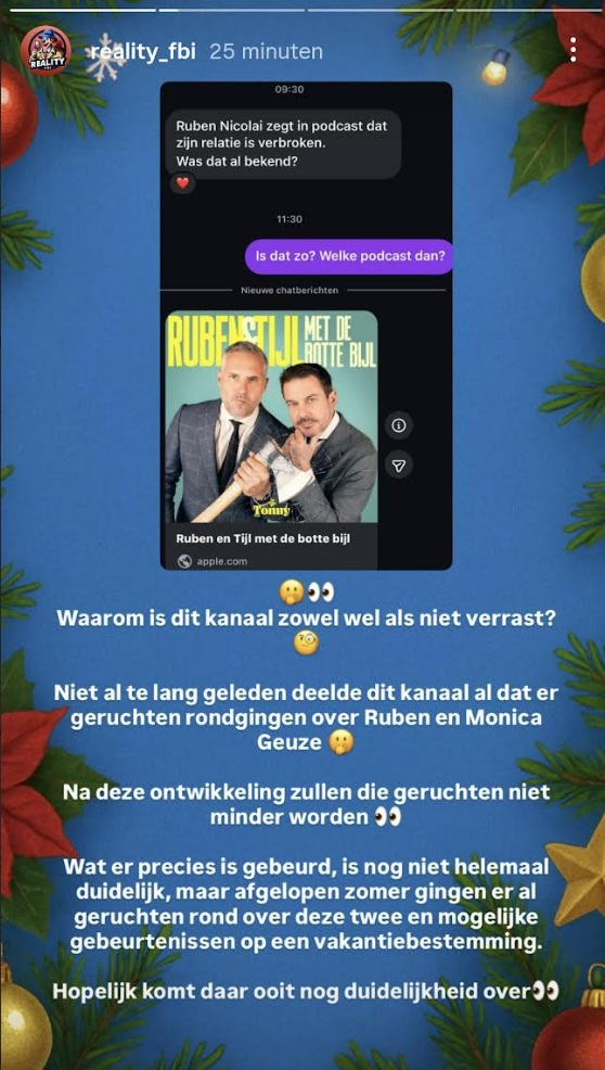 En om het allemaal nog wat sappiger te maken, de relatie van Ruben is voorbij. Dat weet Reality.FBI te melden, het juicekanaal heeft dit weer van Ruben zelf die dit in zijn podcast meldt: “Na deze ontwikkeling zullen die geruchten niet minder worden. wat er precies is gebeurd is nog niet helemaal duidelijk. Maar afgelopen zomer gingen er al geruchten rond over deze twee en mogelijke gebeurtenissen op een vakantiebestemming!” Meer hier: